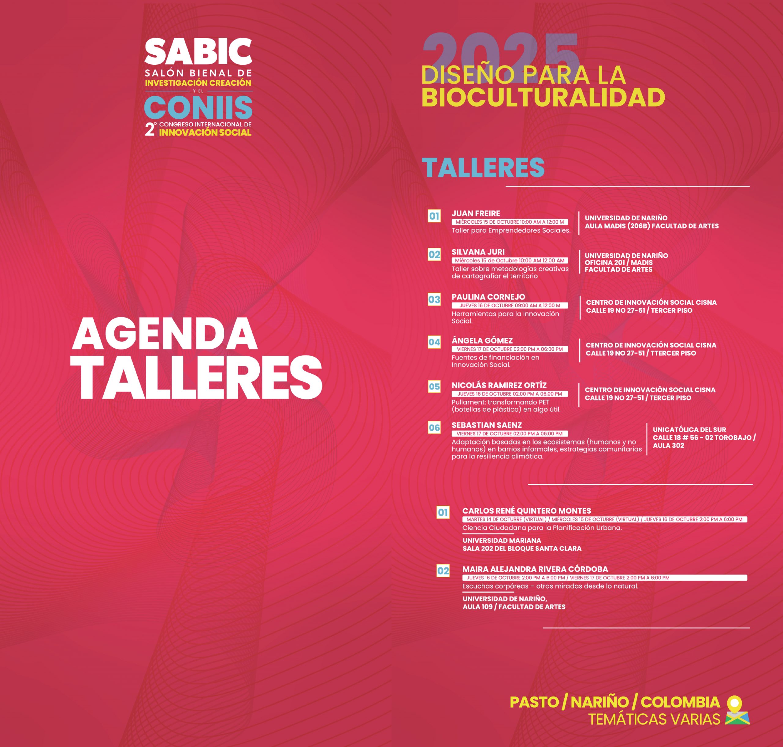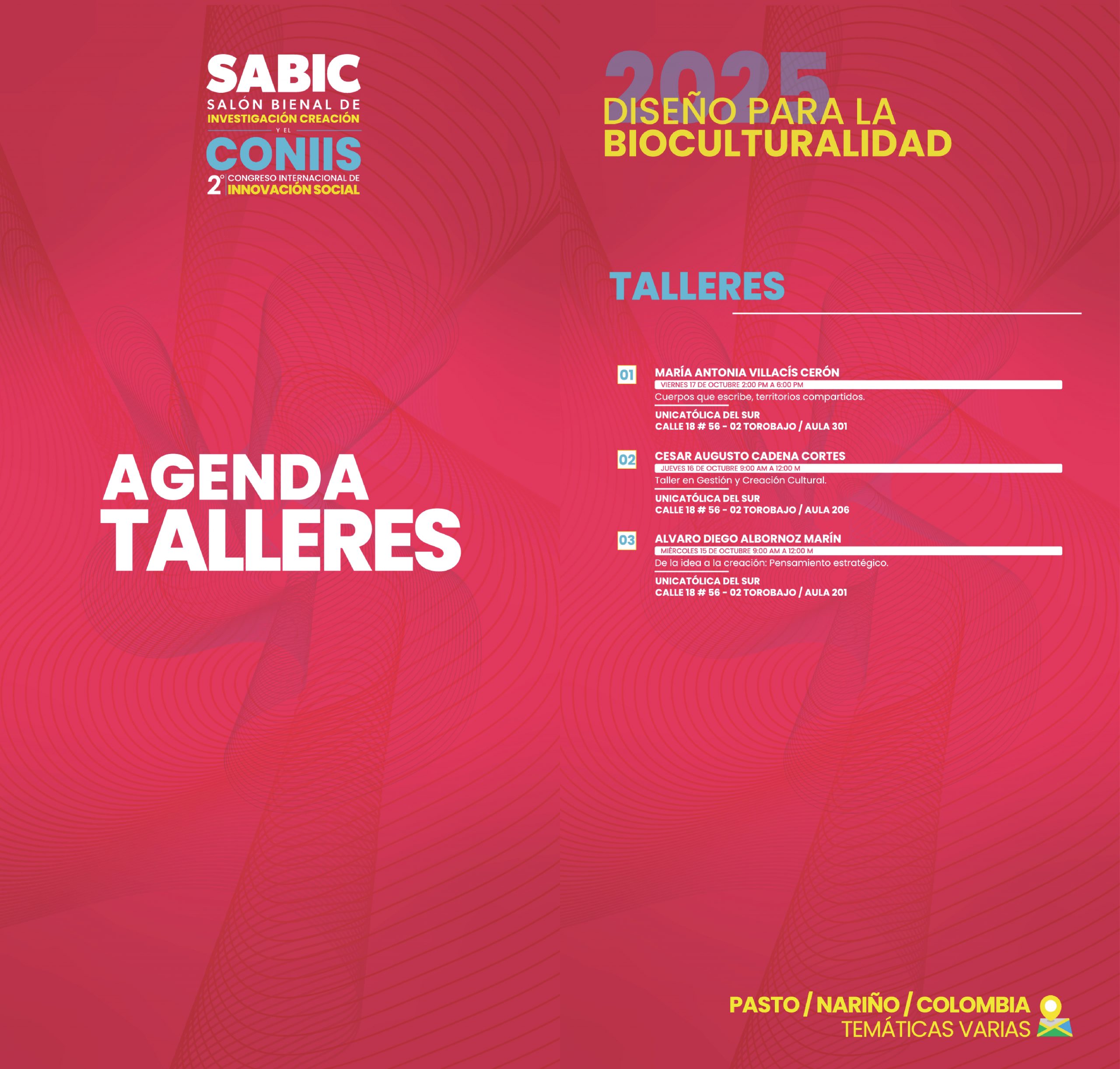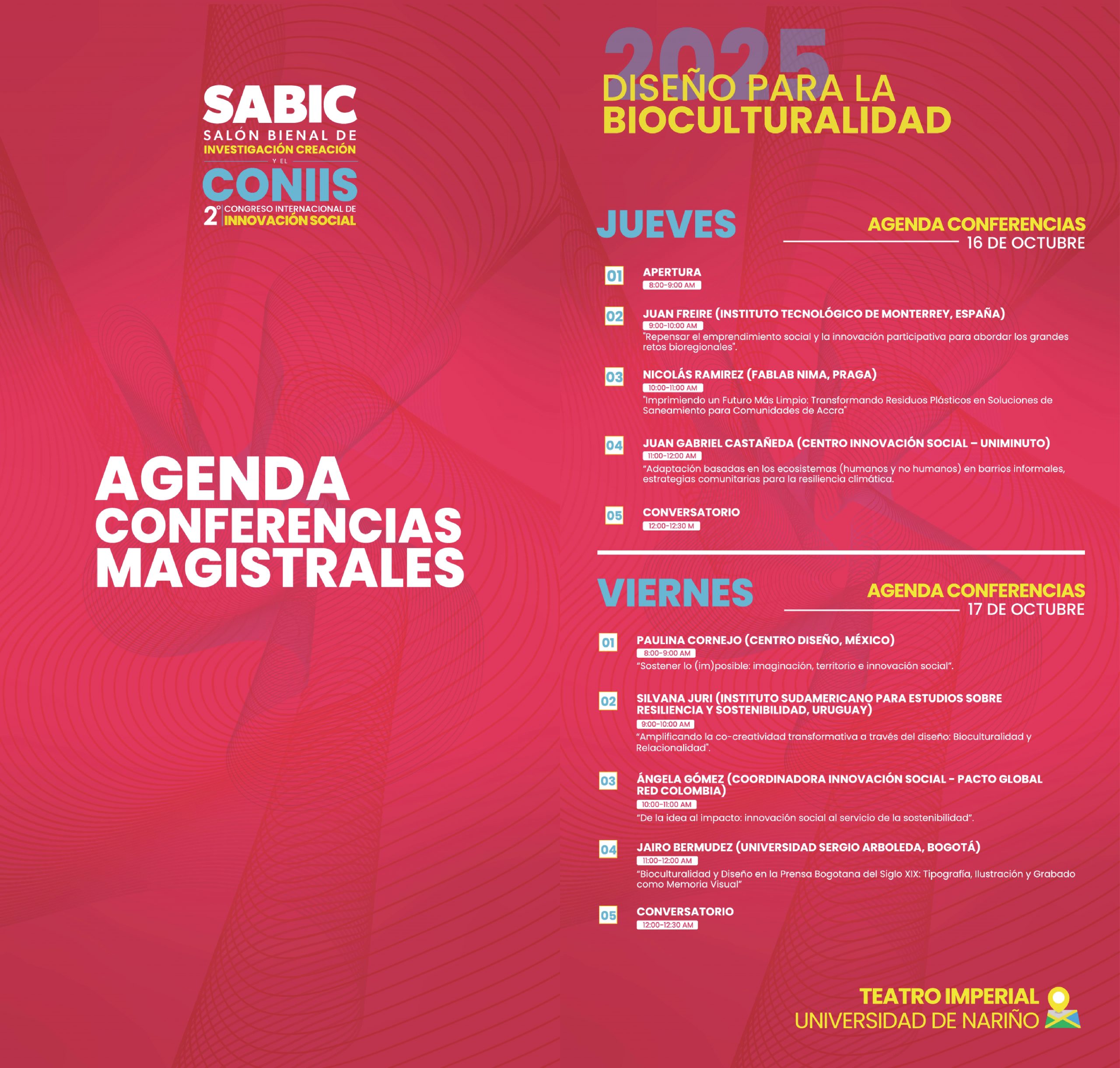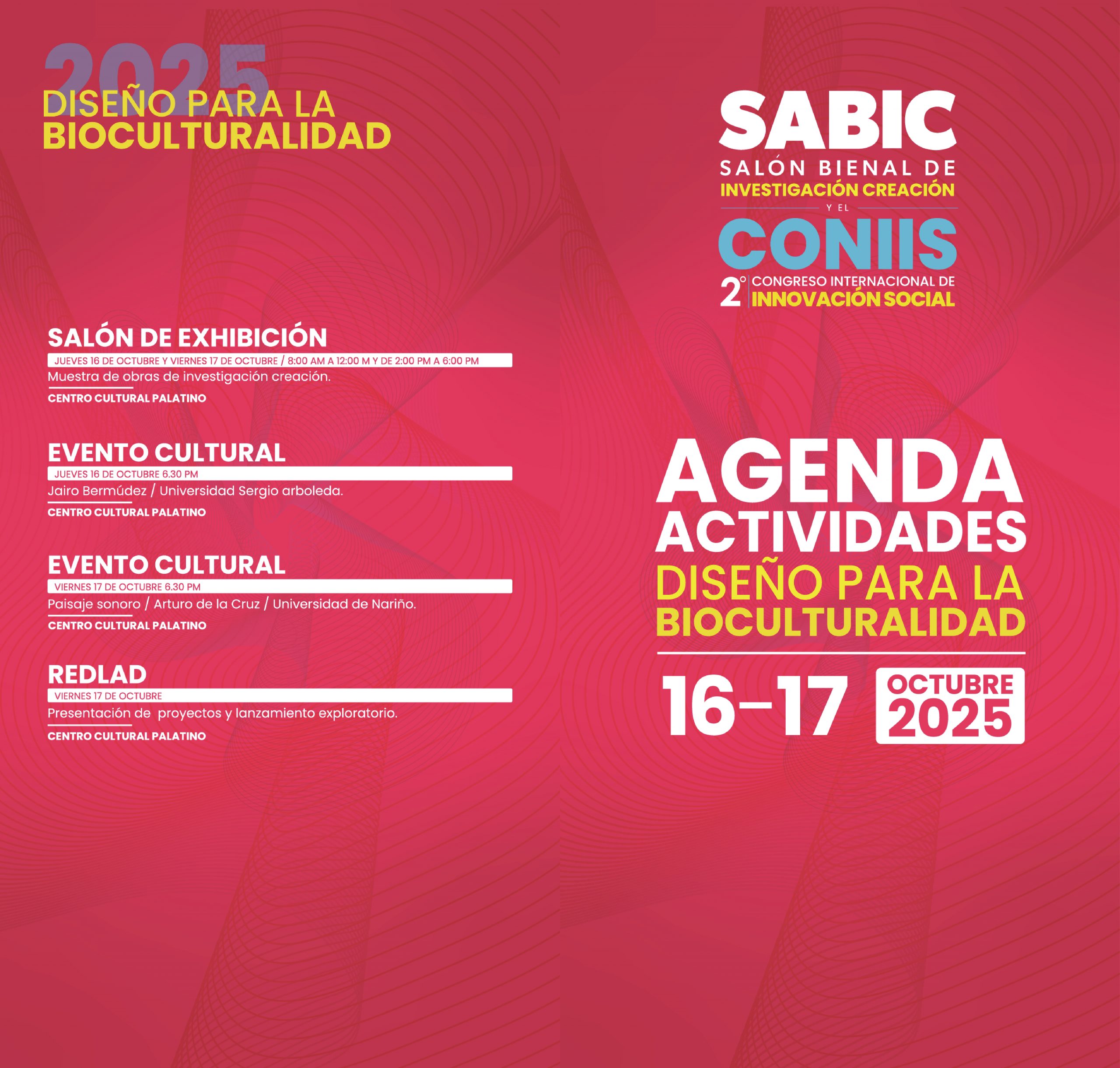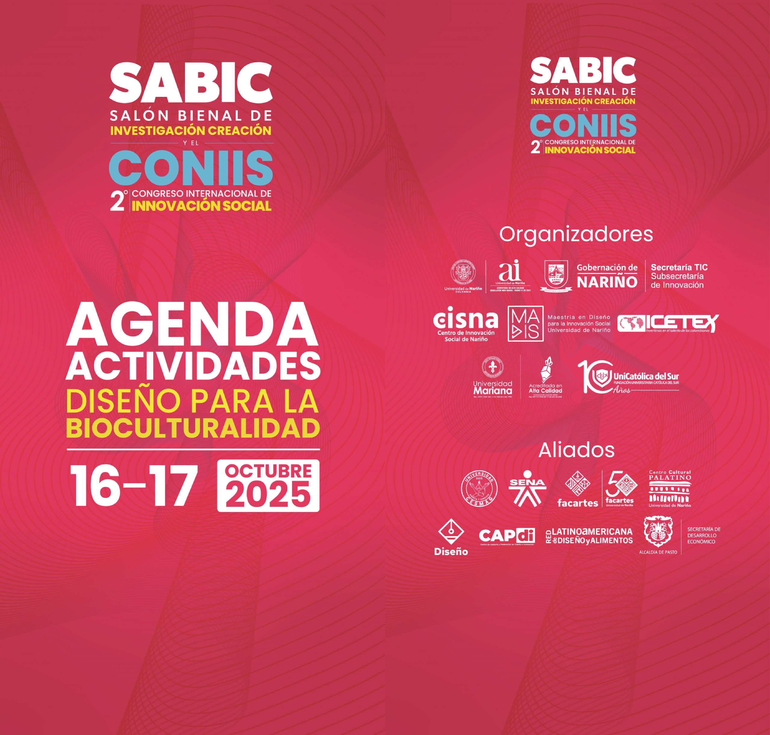 El Salón Bienal de Investigación+Creación 2025 (SABIC), se realizó durante los días 16 y 17 de octubre del 2025, y en esta oportunidad unió esfuerzos con el Segundo Congreso Internacional de Innovación Social (CONIIS), liderado por el Centro de Innovación Social (CISNA), de la Secretaria TIC, Innovación y Gobierno Abierto de la Gobernación de Nariño en alianza con el ICETEX, la Universidad Mariana, la Universidad Católica del Sur, la Fundación Universitaria San Martín, la Universidad CESMAG y la Alcaldía de Pasto a través de la Secretaria de Desarrollo Económico.