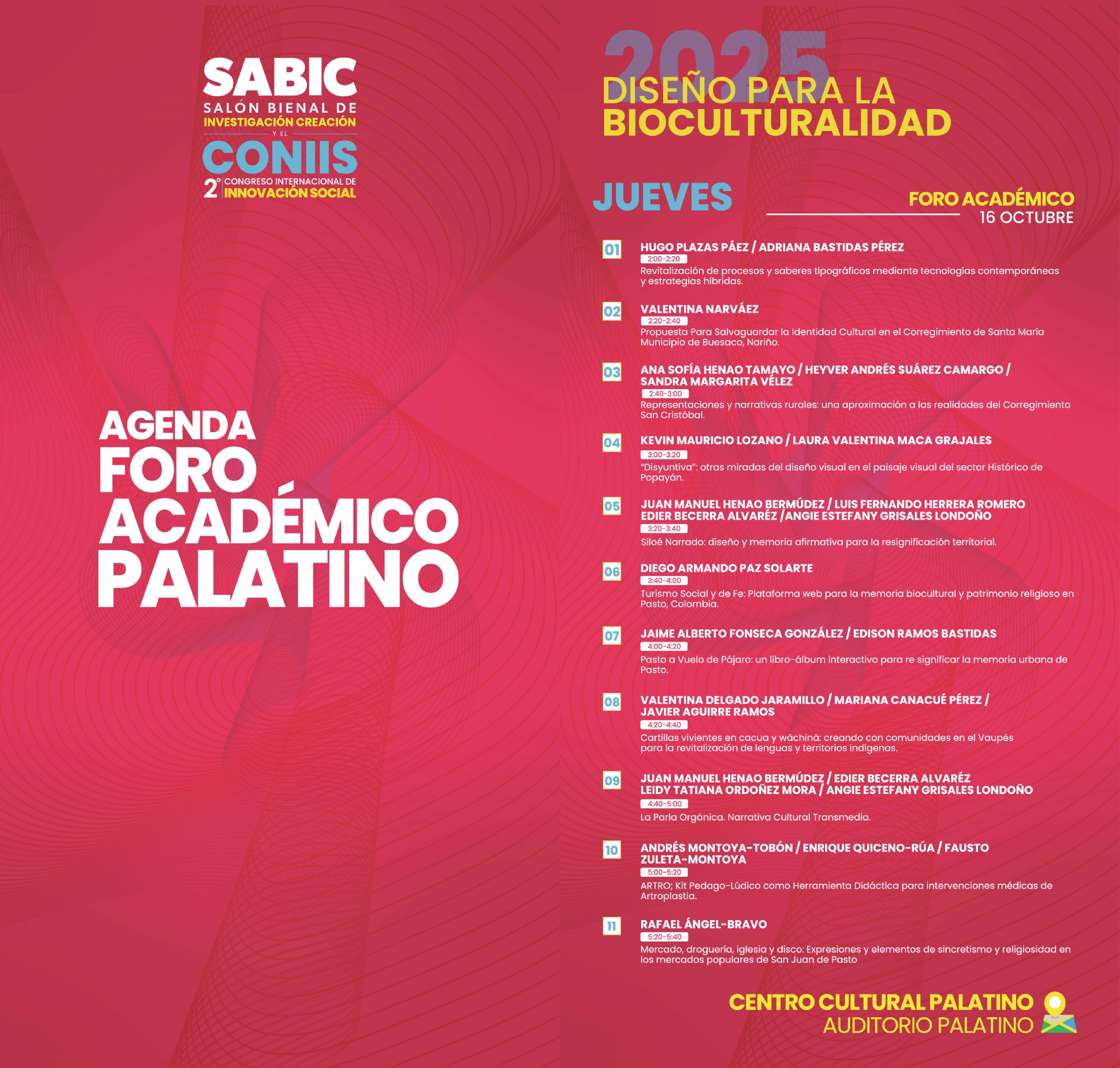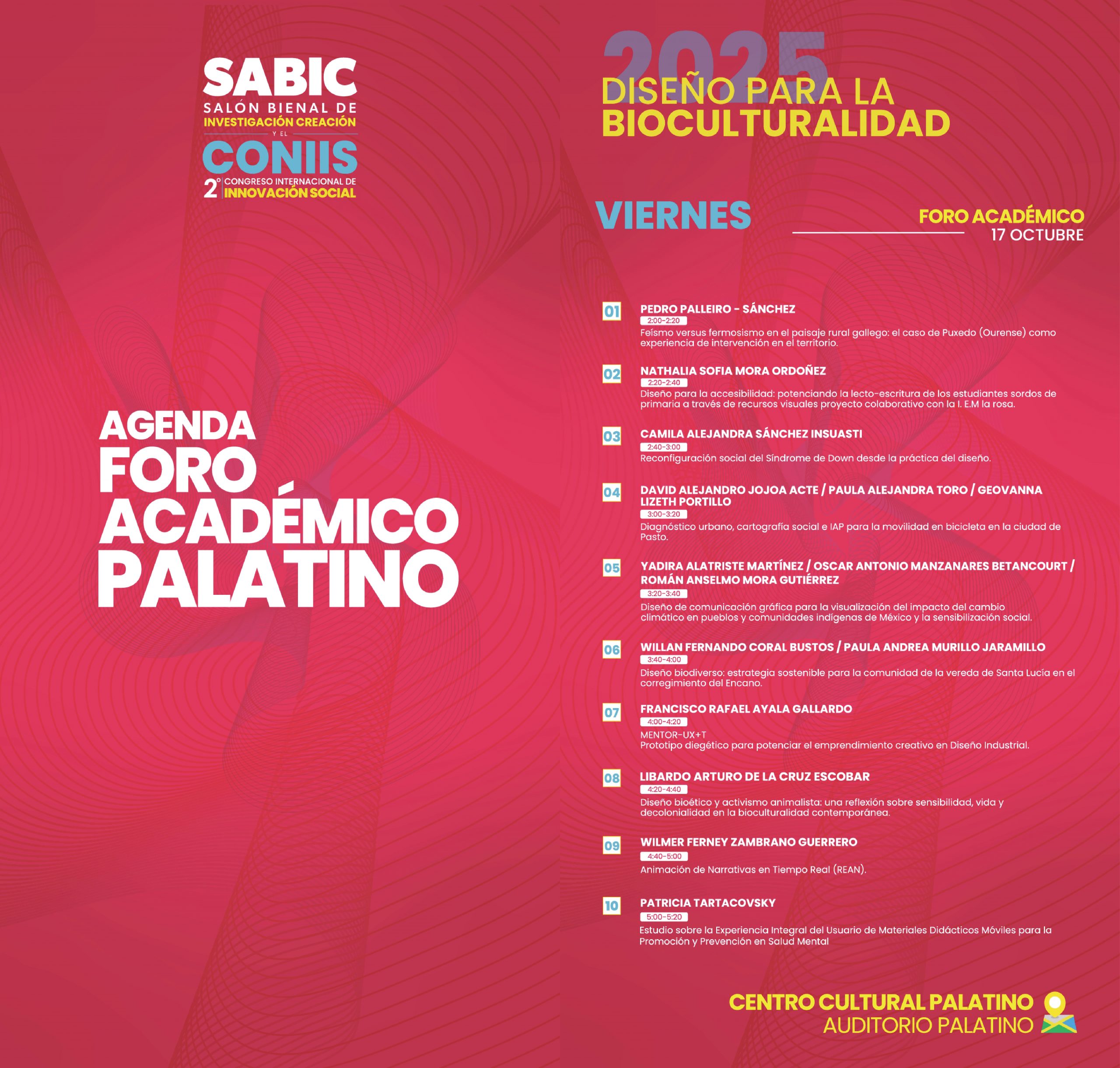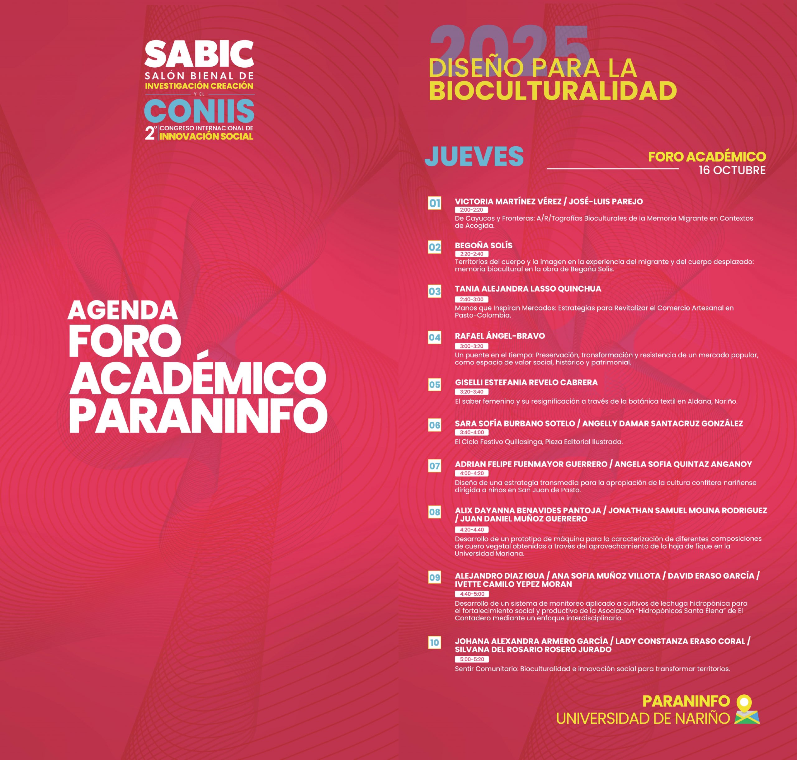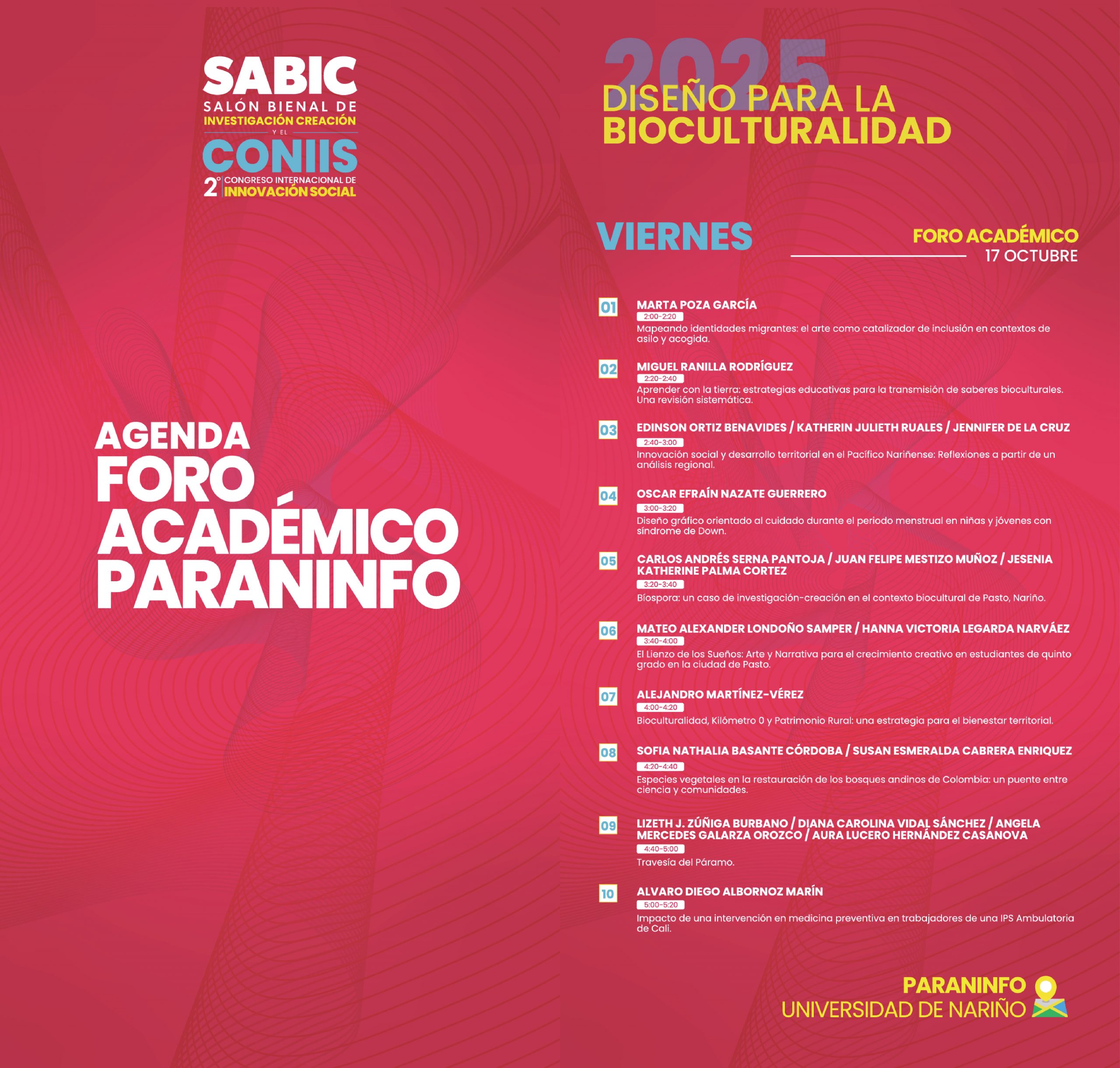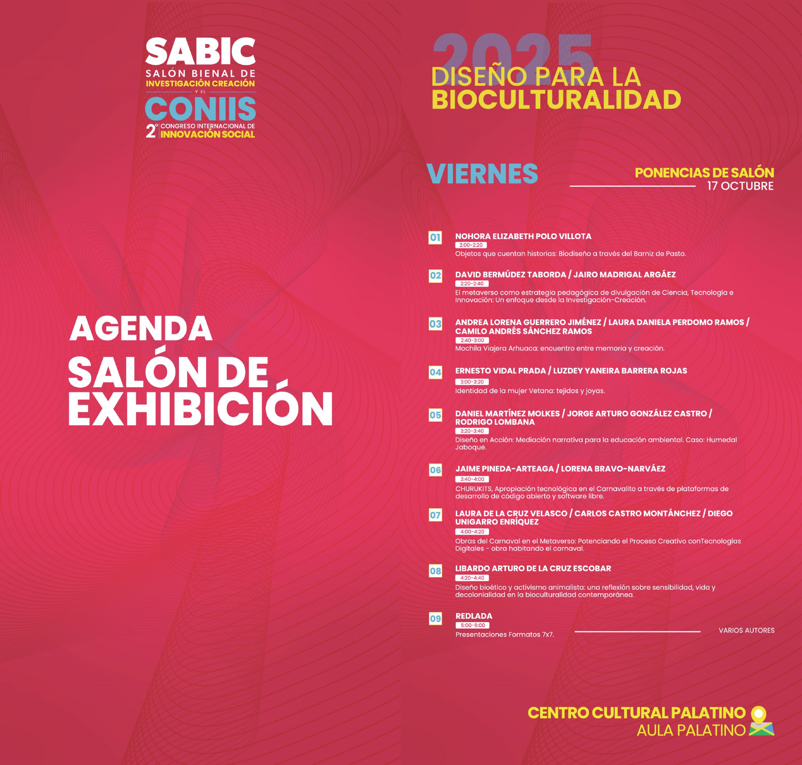 El Salón Bienal de Investigación+Creación 2025 (SABIC), se realizó durante los días 16 y 17 de octubre del 2025, y en esta oportunidad unió esfuerzos con el Segundo Congreso Internacional de Innovación Social (CONIIS), liderado por el Centro de Innovación Social (CISNA), de la Secretaria TIC, Innovación y Gobierno Abierto de la Gobernación de Nariño en alianza con el ICETEX, la Universidad Mariana, la Universidad Católica del Sur, la Fundación Universitaria San Martín, la Universidad CESMAG y la Alcaldía de Pasto a través de la Secretaria de Desarrollo Económico.
